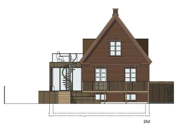 Nyt udtryk til udestuen og udnyttelse af tag til terrasse. Udestuen beklædes med træ og karnapper beklædes med kobber/stål. To værelser på 1. salen har fået karnapper og udgang til tagterrasse.